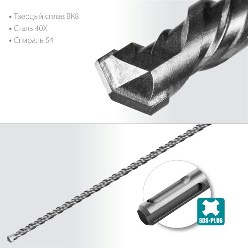 Для ударного сверления отверстий в бетоне, граните, кирпичной кладке, камне и твердых известняках. Используется на легких и средних перфораторах с зажимом SDS-plus.