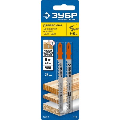 ЗУБР по дереву, фанере, ДСП, ДВП, EU-хвостовик, шаг 4 мм, 75 мм, 2 шт., полотна для эл/лобзика 15584-4_z02 Профессионал