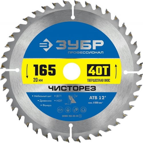 Пильный диск по дереву ЗУБР 36905-165-20-40_z01, предназначен для продольного, поперечного и углового распила древесины и древесных материалов на циркулярных, торцовочных и станковых пилах. вердосплавные резцы марки ВК8С. Автоматизированная высококачественная пайка для надежного крепления зубьев. Закаленный корпус из высоколегированной стали препятствует возникновению биений при работе. Компьютерная балансировка диска для предотвращения биений при работе. Автоматическая трехсторонняя шлифовка зубьев для максимально точной геометрии режущих элементов и чистого реза. Компенсационные прорези исключают внутреннее напряжение и деформацию диска, возникающую при его перегреве во время эксплуатации.