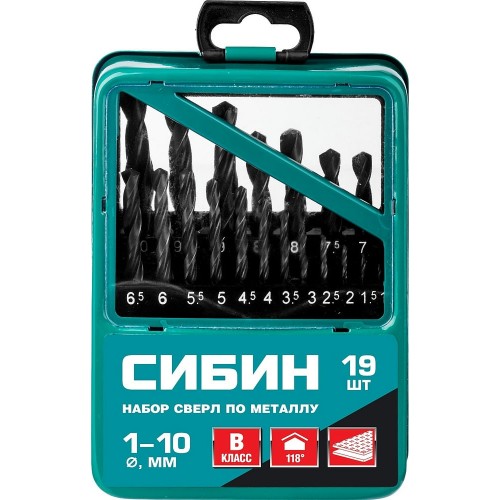 Набор сверл по металлу СИБИН 29610-H19, предназначен для сверления металлических конструкций и заготовок. В набор входят 19 сверл диаметром от 1 до 10 мм, изготовленных из быстрорежущей стали HSS класса В. Поставляется в комплекте с металличесим боксом для удобства хранения.