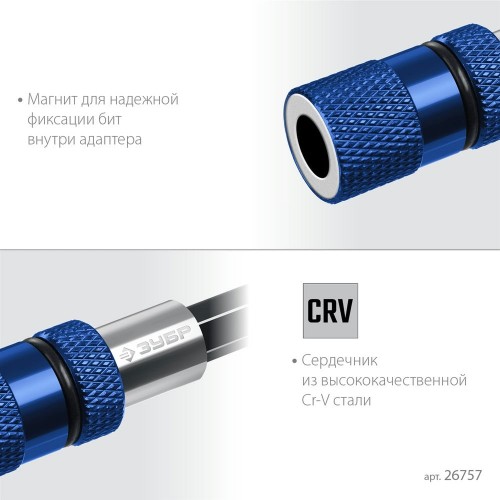 Адаптер для бит ЗУБР 26757, предназначен для монтажа и демонтажа резьбовых соединений совместно с механизированным инструментом. Ограничитель позволяет отрегулировать глубину вкручивания. Магнитное кольцо для удержания крепежа. Изготовлен из высококачественной Cr-V стали. Битодержатель с магнитом надежно удерживает биту.