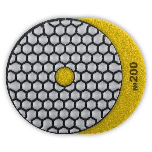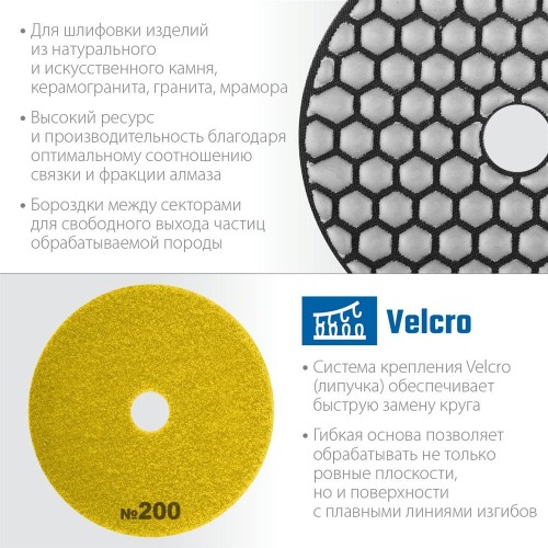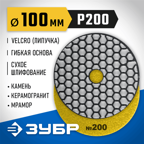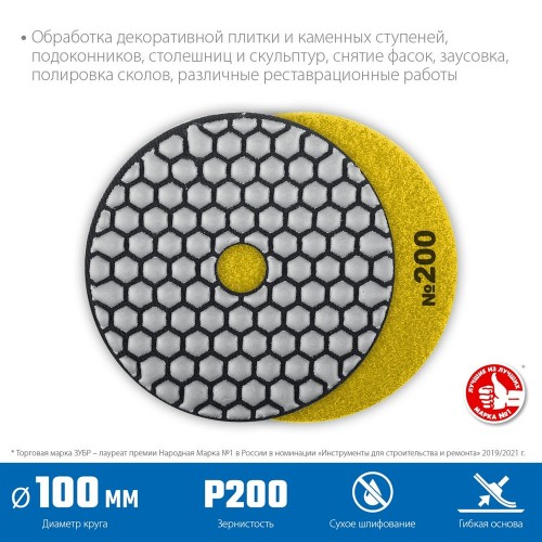 Алмазный гибкий шлифовальный круг (Черепашка) для сухого шлифования ЗУБР 29868-200, предназначен для сухой шлифовки и полировки изделий из натурального и искуственного камня, керамогранита, гранита, мрамора. Используется на ручном электроинструменте (УШМ, полировальные машины, дрели) с насадкой адаптером под липучку Velcro. Охлаждение водой повышает ресурс инструмента. Высокий ресурс и производительность благодаря оптимальному соотношению связки и фракции алмаза. Гибкая основа позволяет обрабатывать не только ровные плоскости, но и поверхности с плавными линиями изгибов. Система крепления Velcro (липучка) обеспечивает быструю замену круга. Широкая сфера применения: обработка каменных столешниц, подоконников, ступеней, скульптур, декоративной плитки, снятие фасок, заусовка, полировка сколов, различные реставрационные работы.