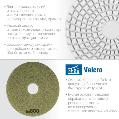 Алмазный гибкий шлифовальный круг (Черепашка) для мокрого шлифования ЗУБР 29866-800, предназначен для предназначен для предназначен для шлифовки и полировки изделий из натурального и искуственного камня, керамогранита, гранита, мрамора с применением водяного охлаждения. Используется на ручном электроинструменте (УШМ, полировальные машины, дрели) с насадкой адаптером под липучку Velcro. Высокий ресурс и производительность благодаря оптимальному соотношению связки и фракции алмаза. Гибкая основа позволяет обрабатывать не только ровные плоскости, но и поверхности с плавными линиями изгибов. Система крепления Velcro (липучка) обеспечивает быструю замену круга. Широкая сфера применения: обработка каменных столешниц, подоконников, ступеней, скульптур, декоративной плитки, снятие фасок, заусовка, полировка сколов, различные реставрационные работы.