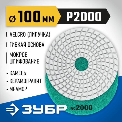 Алмазный гибкий шлифовальный круг (Черепашка) для мокрого шлифования ЗУБР 29866-2000, предназначен для предназначен для шлифовки и полировки изделий из натурального и искуственного камня, керамогранита, гранита, мрамора с применением водяного охлаждения. Используется на ручном электроинструменте (УШМ, полировальные машины, дрели) с насадкой адаптером под липучку Velcro. Высокий ресурс и производительность благодаря оптимальному соотношению связки и фракции алмаза. Гибкая основа позволяет обрабатывать не только ровные плоскости, но и поверхности с плавными линиями изгибов. Система крепления Velcro (липучка) обеспечивает быструю замену круга. Широкая сфера применения: обработка каменных столешниц, подоконников, ступеней, скульптур, декоративной плитки, снятие фасок, заусовка, полировка сколов, различные реставрационные работы.