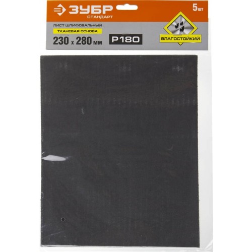 ЗУБР 230 х 280 мм, Р180, 5 шт., на тканевой основе, водостойкий, лист шлифовальный 35415-180 Стандарт