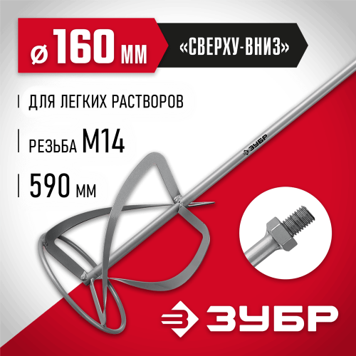 Насадка с лопастями для перемешивания легких растворов (краска, грунтовка, штукатурка, наливной пол, затирка). Используется совместно с ручными миксерами ЗУБР ЗМР-1200Э-1, МР-1050-1, МР-1100, МР-1400-2 и МР-1600-2.