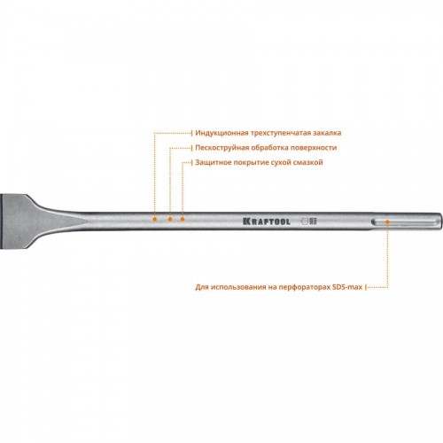 Зубило лопаточное 400 мм, SDS-max, KRAFTOOL 29334-50-400_z01, предназначено для удаления штукатурки, выступов на бетонной обшивке, реконструкции стальных конструкций. Используется с перфораторами SDS-max. Особенности изделия: увеличенный срок службы, индукционная трехступенчатая закалка, высокопрочная легированная сталь. Обладает высокой стойкостью к ударам и динамическим нагрузкам.