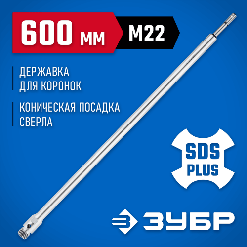 Державка ЗУБР 29187-600, предназначена для использования с коронками по бетону с посадкой М22 и центрирующими сверлами с коническим хвостовиком на перфораторах с зажимом SDS-plus и мощностью не менее 850 Вт для работ по бетону, граниту, природному и искусственному камню, кирпичной кладке в режиме сверления с ударом. Коронки по бетону используются совместно с державками и центрирующими сверлами. Широкий ассортимент оснастки ЗУБР позволяет реализовать самые сложные задачи в работе по бетону, камню и кирпичу. Конусная посадка обеспечивает возможность быстрой фиксации и замены центрирующего сверла без применения дополнительных крепежных элементов. Высокопрочная легированная сталь. Резьбовая посадка М22 обеспечивает надежное крепление коронки с державкой. Увеличенная рабочая длина державки для сверления глубоких отверстий. Износостойкое покрытие защищает от коррозии.
