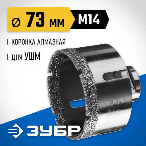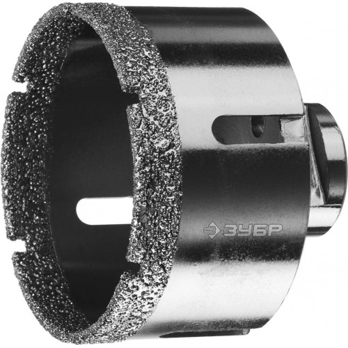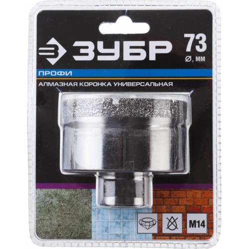 Буровая коронка алмазная ЗУБР 29865-73, применяется для сверления отверстий из керамогранита, камня, керамики, бетона, кирпича, ограниченно листового металла, дерева и комбинаций всех этих материалов. Используется на УШМ. специальная технология вакуумного спекания алмазов позволяет работать без применения водяного охлаждения. Высокий рабочий ресурс.