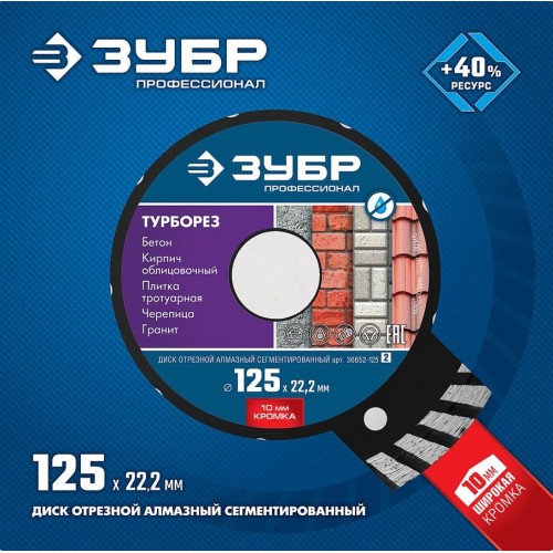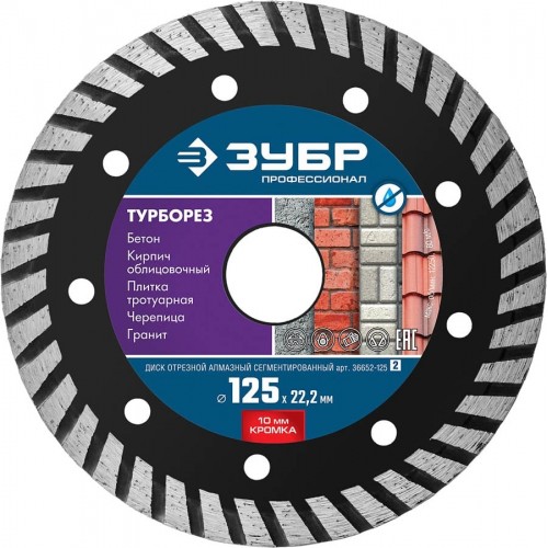 Диск отрезной алмазный сегментированный для УШМ 125 х 22.2 мм, ЗУБР 36652-125_z02, предназначен для резки бетона, бордюрного камня, облицовочного кирпича, тротуарной плитки и других строительных материалов без принудительного охлаждения. Корпуса алмазных кругов изготовлены из прочной легированной стали, способной выдержать значительную механическую нагрузку и высокую температуру. Оригинальная сегментированная форма режущей кромки позволяет быстро и эффективно осуществлять необходимые резы в обрабатываемом материале. Высококачественные синтетические алмазы. Оптимально подобранные компоненты металлической связки с высотой сегмента в 10 мм гарантируют продолжительный рабочий ресурс круга при работе даже с самыми сложными в обработке материалами. Высокая скорость реза и увеличенный рабочий ресурс круга обеспечиваются особой технологией горячего спекания. Минимизация бокового трения благодаря сегментированной форме режущей кромки.
