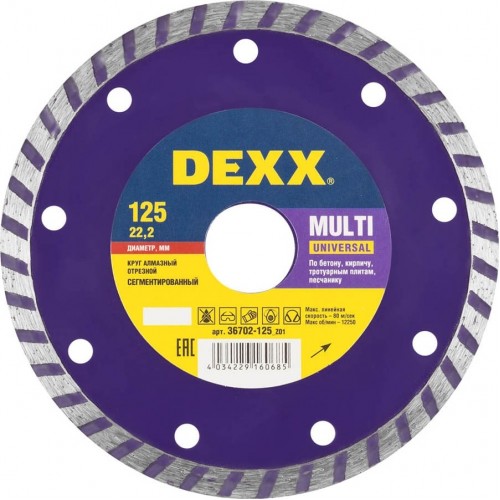 Алмазный диск отрезной DEXX 36702-125_z01, предназначен для резки бордюрного камня, тротуарной плитки, облицовочного кирпича с помощью УШМ. Высококачественная сталь обеспечивает прочность и долговечность диска, алмазное напыление позволяет легко и максимально-точно производить работы.