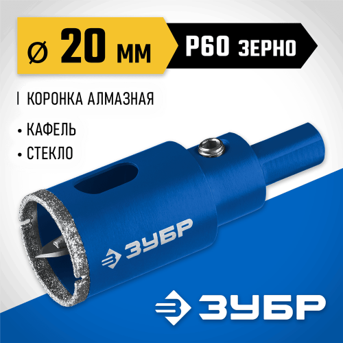 Буровая коронка алмазная ЗУБР 29850-20, применяется для сверления отверстий в керамической и кафельной плитке при обязательном водяном охлаждении. Высокая статическая и динамическая прочность алмазов. Равномерное распределение алмазного зерна обеспечивает аккуратное сверление материала без трещин и сколов. Центрующее сверло исключает возможность смещения инструмента во время работы.