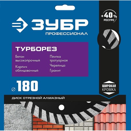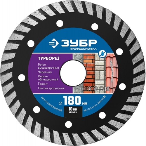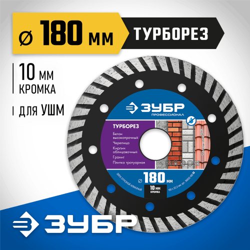 Диск отрезной алмазный сегментированный для УШМ 180 х 22.2 мм, ЗУБР 36652-180_z02, предназначен для резки бетона, бордюрного камня, облицовочного кирпича, тротуарной плитки и других строительных материалов без принудительного охлаждения. Корпуса алмазных кругов изготовлены из прочной легированной стали, способной выдержать значительную механическую нагрузку и высокую температуру. Оригинальная сегментированная форма режущей кромки позволяет быстро и эффективно осуществлять необходимые резы в обрабатываемом материале. Высококачественные синтетические алмазы. Оптимально подобранные компоненты металлической связки с высотой сегмента в 10 мм гарантируют продолжительный рабочий ресурс круга при работе даже с самыми сложными в обработке материалами. Высокая скорость реза и увеличенный рабочий ресурс круга обеспечиваются особой технологией горячего спекания. Минимизация бокового трения благодаря сегментированной форме режущей кромки.