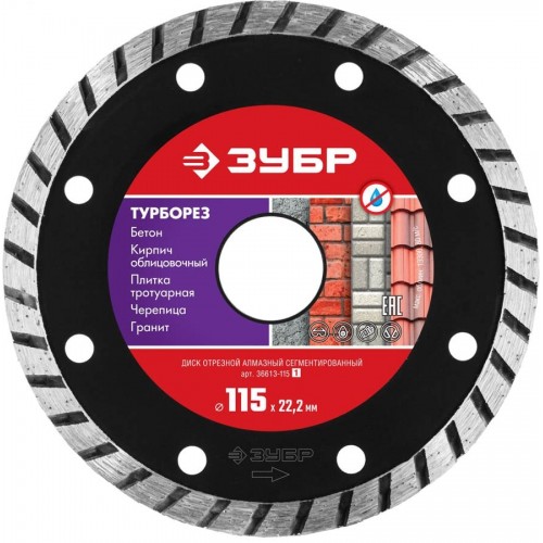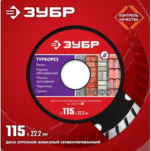 Диск отрезной алмазный сегментированный для УШМ 115 x 22.2 мм, ЗУБР 36613-115_z01, предназначен для резки бетона, бордюрного камня, облицовочного кирпича, тротуарной плитки и других строительных материалов без принудительного охлаждения. Корпуса алмазных кругов изготовлены из прочной легированной стали, способной выдержать значительную механическую нагрузку и высокую температуру. Оригинальная сегментированная форма режущей кромки позволяет быстро и эффективно осуществлять необходимые резы в обрабатываемом материале. Высококачественные синтетические алмазы. Оптимально подобранные компоненты металлической связки гарантируют продолжительный рабочий ресурс круга при работе даже с самыми сложными в обработке материалами. Сегментированная режущая кромка обеспечивает эффективную работу.