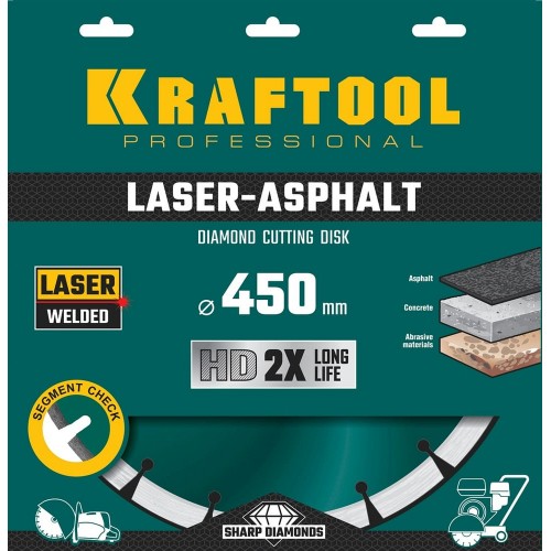 Алмазный диск отрезной KRAFTOOL 36687-450, применяется для резки асфальта. Технология LWB (Laser Welded Blades) гарантирует надежную работу инструмента даже при высоких нагрузках и без применения охлаждения. Луч лазера проваривает стык между алмазным сегментом и стальным закаленным корпусом, образуя прочный монолитный шов. Оптимально подобранные компоненты металлической связки с высотой сегмента в 10 мм гарантируют продолжительный рабочий ресурс диска. Корпуса алмазных дисков изготовлены из прочной легированной стали, способной выдержать значительную механическую нагрузку и высокую температуру. Специальные скошенные сегменты защищают корпус диска от преждевременного изнашивания.