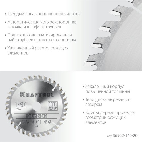 KRAFTOOL PRECISION 140х20мм 36Т, диск пильный по дереву (36952-140-20)