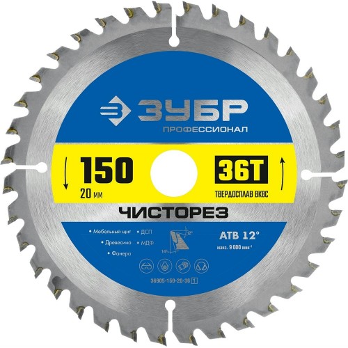 Диск пильный по дереву ЗУБР Чисторез 36905-150-20-36_z01, предназначен для продольного, поперечного и углового распила древесины и древесных материалов на циркулярных, торцовочных и станковых пилах. вердосплавные резцы марки ВК8С. Автоматизированная высококачественная пайка для надежного крепления зубьев. Закаленный корпус из высоколегированной стали препятствует возникновению биений при работе. Компьютерная балансировка диска для предотвращения биений при работе. Автоматическая трехсторонняя шлифовка зубьев для максимально точной геометрии режущих элементов и чистого реза. Компенсационные прорези исключают внутреннее напряжение и деформацию диска, возникающую при его перегреве во время эксплуатации.