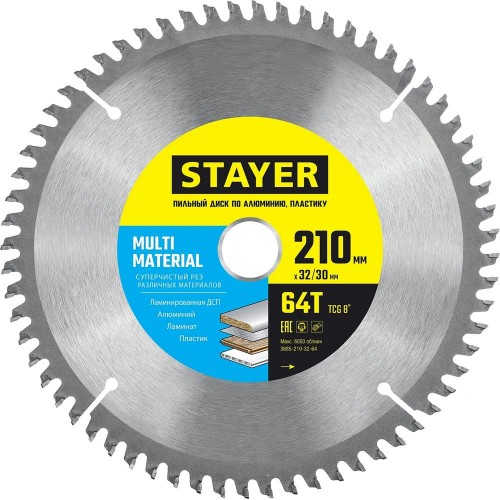 Диск пильный по алюминию STAYER MULTI MATERIAL 3685-210-32-64, предназначен для продольного, поперечного и углового распила на циркулярных, торцовочных и станковых пилах. Прецизионная автоматическая четырехсторонняя заточка зубьев повышает точность реза. Специальные компенсационные прорези снижают внутреннее напряжение, возникающее при перегреве, что исключает деформацию диска. Инновационная форма диска снижает уровень шума.