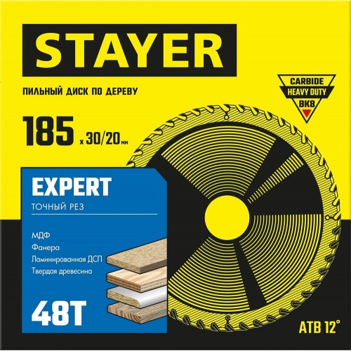Диск пильный по дереву STAYER EXPERT 3682-185-30-48_z01, предназначен для продольных и поперечных пропилов фанеры, столярных плит и щитов, паркетной доски, прессованной клееной древесины, МДФ, ламинированной ДСП, комбинированных материалов.
