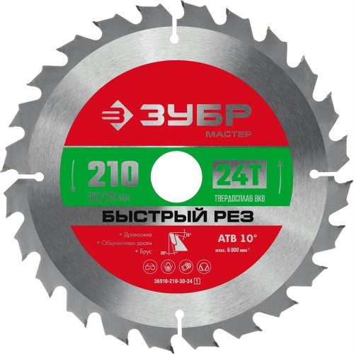Пильный диск по дереву ЗУБР 36910-210-30-24_z01, предназначен для продольных и поперечных пропилов твердой и мягкой древесины, обшивочных необработанных досок, неламинированной ДСП, строительного бруса и строительной древесины с остатками краски.