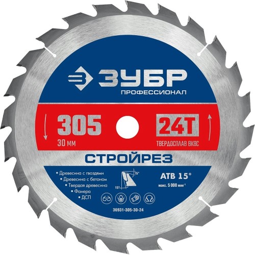 Диск пильный по строительной древесине ЗУБР 36931-305-30-24, предназначен как для пиления, так и для поперечных выборок материала благодаря особой геометрии режущих элементов. Пильные диски оптимальны для безопасной работы и получения чистого и аккуратного реза.
