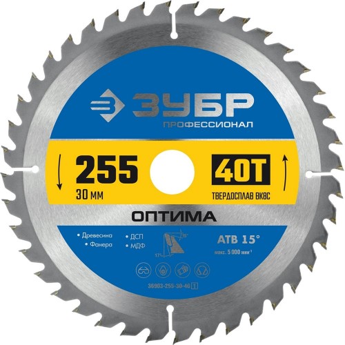Пильный диск по дереву ЗУБР 36903-255-30-40_z01, предназначен для продольных и поперечных пропилов твердой и мягкой древесины, обшивочных необработанных досок, неламинированной ДСП, строительного бруса и строительной древесины с остатками краски.