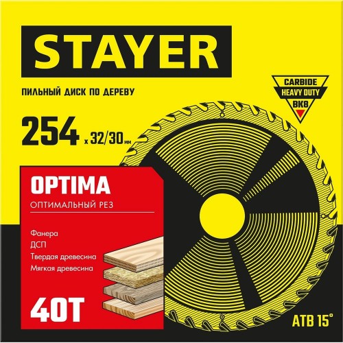 Пильный диск по дереву STAYER 3681-254-32-40_z01, предназначен для продольных и поперечных пропилов твердой и мягкой древесины, обшивочных необработанных досок, неламинированной ДСП, строительного бруса и строительной древесины с остатками краски.