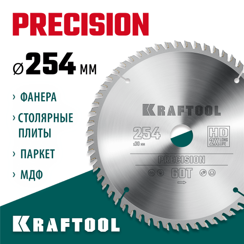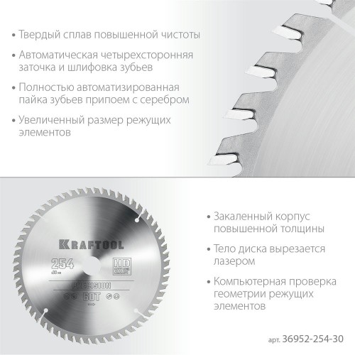 Пильный диск по дереву KRAFTOOL 36952-254-30, используется для быстрых пропилов вдоль и поперек волокон в твердой и мягкой древесине, фанере, ДСП. Предназначен для ручных циркулярных пил, торцовочных и станковых пил. Увеличенный размер режущих элементов значительно увеличивает сопротивляемость нагрузкам. Закаленный корпус повышенной толщины из высоколегированной стали дольше сохраняет жесткость корпуса пильного диска. Компенсационные прорези снижают уровень шума при работе и препятствуют деформации диска от перегрева. Серия ″PRECISION″ отлично подходит для чистого и точного распила всех типов древесины.