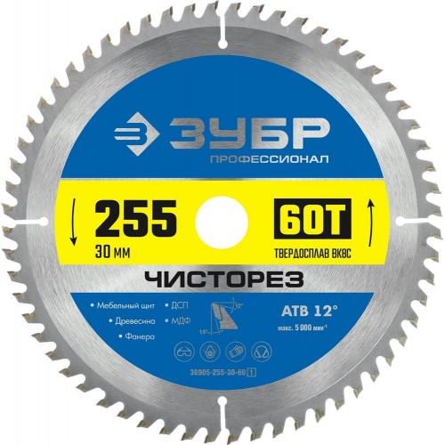 Пильный диск по дереву ЗУБР 36905-255-30-60_z01, предназначен для точного и чистого распила всех типов древесины (мебельный щит, ДСП, фанера и т.п.) Твердосплавные резцы марки ВК8С. Автоматизированная высококачественная пайка для надежного крепления зубьев. Закаленный корпус из высоколегированной стали препятствует возникновению биений при работе. Компьютерная балансировка диска для предотвращения биений при работе. Автоматическая трехсторонняя шлифовка зубьев для максимально точной геометрии режущих элементов и чистого реза.