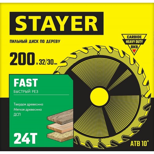 Диск пильный по дереву STAYER FAST 3680-200-32-24_z01, предназначен для продольных и поперечных пропилов твердой и мягкой древесины, обшивочных необработанных досок, не ламинированной ДСП, строительного бруса и строительной древесины с остатками краски.