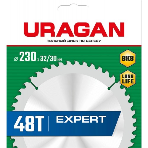 Диск пильный по дереву URAGAN Expert 36802-230-32-48_z01, предназначен для точного и чистого распила всех типов древесины. Особая форма твердосплавного зуба с переменным углом наклона верхней плоскости специально разработана для эффективного и производительного пиления фанеры, твердой и мягкой древесины, обшивочных и необработанных досок.