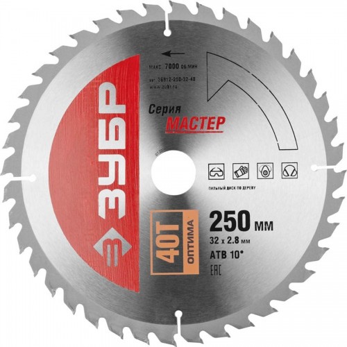 Пильный диск по дереву ЗУБР 36912-250-32-40, предназначен для быстрого распила всех типов древесины. Подходит для продольного, поперечного и углового распила твердых и мягких пород дерева, клеевых плит, МДФ (в том числе облицованных натуральным шпоном, меланиновой пленкой, бумагой, пластиком и др.), фанеры и облицованной фанеры на циркулярных, торцовочных и станковых пилах. Повышенный контроль качества на всех стадиях производства обеспечивают высокую точность выпускаемых изделий и гарантируют продолжительный рабочий ресурс каждого пильного диска.
