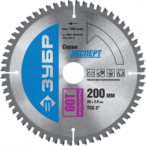 Пильный диск по алюминию ЗУБР 36907-200-30-60, предназначен для пиления цветных металлов, композитных материалов, ламинированных плит, полимерных и эпоксидных материалов, алюминиевого профиля на циркулярных и торцовочных пилах. Автоматизированная высококачественная пайка для надежного крепления зубьев. Автоматическая трехсторонняя шлифовка зубьев для максимально точной геометрии режущих элементов и чистого реза. Компьютерная балансировка диска для предотвращения биений при работе. Компенсационные прорези исключают внутреннее напряжение и деформацию диска, возникающую при его перегреве во время эксплуатации.