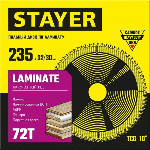 Диск пильный по ламинату STAYER 3684-235-32-72_z01, предназначен для аккуратного реза по ламинату, МДФ, фанере, ламинированному ДСП, паркетной доске. Внешний диаметр диска: 235 мм. Посадочный диаметр: 32/30 мм. Количество твердосплавных зубьев: 72 шт.