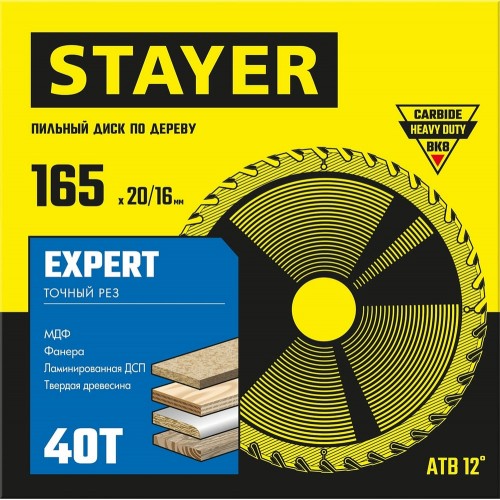 STAYER EXPERT 165 x 20/16мм 40T, диск пильный по дереву, точный рез