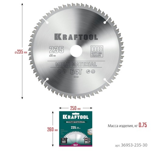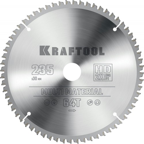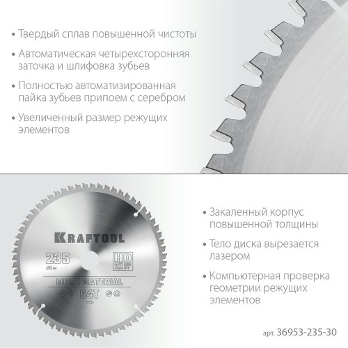 Пильный диск по алюминию KRAFTOOL 36953-235-30, используется для распилов в алюминиевых листах и плитах, пластиковых панелях, твердой и мягкой древесине, ламинированных плитах, ДСП с покрытием. Предназначен для ручных циркулярных пил, торцовочных и станковых пил. Увеличенный размер режущих элементов значительно увеличивает сопротивляемость нагрузкам. Закаленный корпус повышенной толщины из высоколегированной стали дольше сохраняет жесткость корпуса пильного диска. Компенсационные прорези снижают уровень шума при работе и препятствуют деформации диска от перегрева. Серия ″Multi Material″ позволяет резать разнообразные материалы, такие как цветные металлы, пластик, ламинированные плиты, комбинированные, полимерные и эпоксидные материалы.