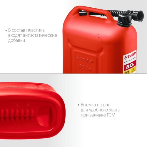 Пластиковая канистра ЗУБР 38366-20 предназначена для хранения и транспортировки топлива и технических жидкостей. Устойчива к механическим воздействиям даже при отрицательных температурах (до -30°C). В состав пластика входят антистатические добавки. Крышка с маслобензостойким уплотнителем. Гибкий носик для заливки ГСМ. Защита крышки от случайного откручивания. Выемка на дне для удобного хвата при заливке ГСМ. Допускается использование на АЗС.