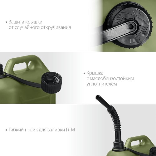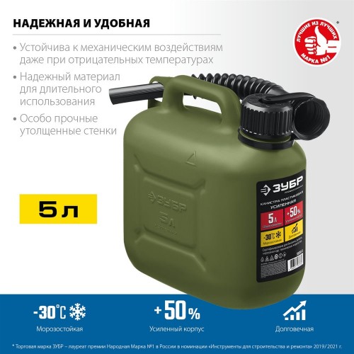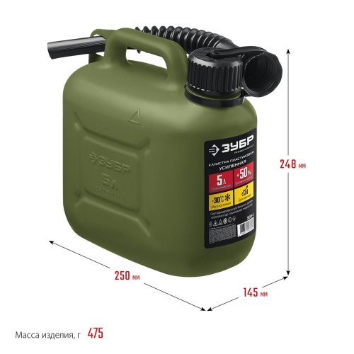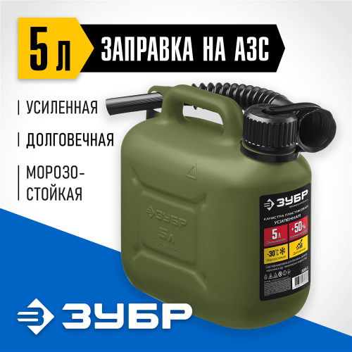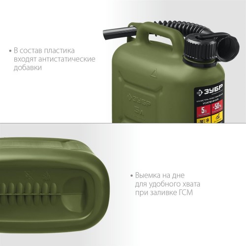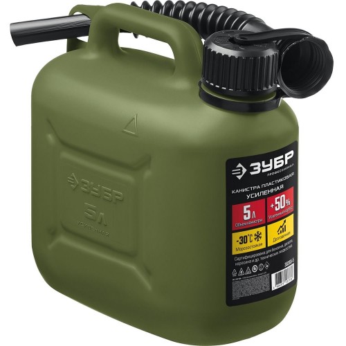 Пластиковая канистра ЗУБР 38365-5 предназначена для хранения и транспортировки топлива и технических жидкостей. Устойчива к механическим воздействиям даже при отрицательных температурах (до -30°C). Особо прочные утолщенные стенки. В состав пластика входят антистатические добавки. Крышка с маслобензостойким уплотнителем. Гибкий носик для заливки ГСМ. Защита крышки от случайного откручивания. Выемка на дне для удобного хвата при заливке ГСМ. Допускается использование на АЗС.