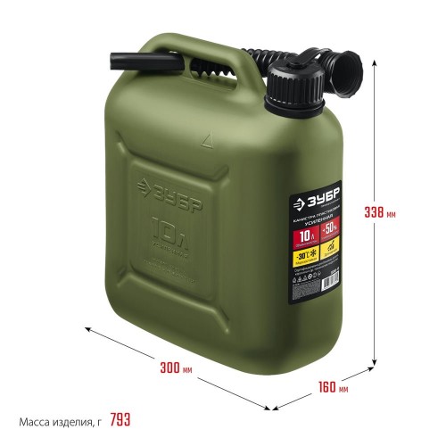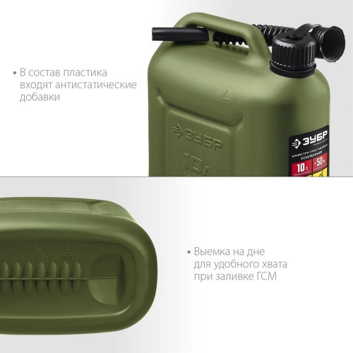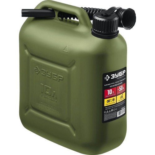 Пластиковая канистра усиленная ЗУБР 38365-10 предназначена для хранения и транспортировки топлива и технических жидкостей. Устойчива к механическим воздействиям даже при отрицательных температурах (до -30°C). Особо прочные утолщенные стенки. В состав пластика входят антистатические добавки. Крышка с маслобензостойким уплотнителем. Гибкий носик для заливки ГСМ. Защита крышки от случайного откручивания. Выемка на дне для удобного хвата при заливке ГСМ. Допускается использование на АЗС.