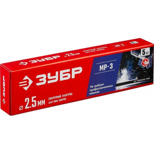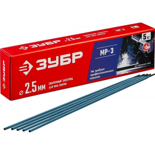 Электрод сварочный ЗУБР 40015-2.5, предназначен для сварки методом MMA.предназначен для сварки ответственных конструкций из углеродистых низколегированных сталей. Применяются на ММА сварочных инверторах. Работы переменным и постоянным током любой полярности. Малое искрообразование, а также легкое первичное и повторные зажигания сварочной дуги. Легкое отделение шлаковой корки и минимальное количество вредных выбросов. Допускается сварка влажного, ржавого и плохо очищенного металла. Оптимальны для использования в бытовых условиях и на небольших производствах. Изготовлены в РОССИИ на современном высокотехнологичном оборудовании по оригинальной технологии и рецептуре в соответствии с ГОСТ 9466-75.