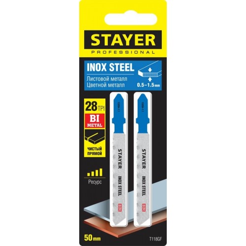 STAYER по металлу (листовой, цветной), EU-хвостовик, шаг 1.1 мм, 50 мм, 2 шт., полотна для эл/лобзика Bi-Metal 15994-1.1_z02 Professional