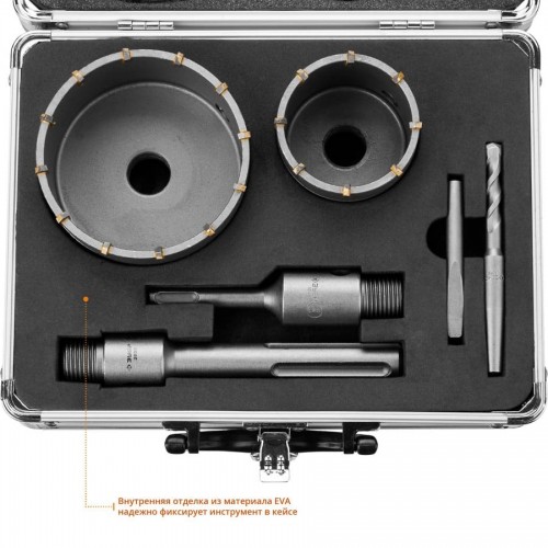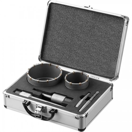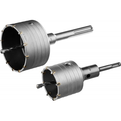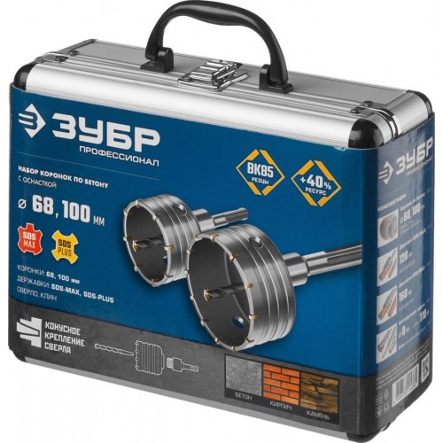 Набор коронок по бетону с оснасткой ЗУБР 29185-H2-2, предназначен для работ при прокладке коммуникаций в строящемся здании, где не обойтись без коронок по бетону. Они позволяют без труда получать отверстия среднего или большого диаметра в самых прочных материалах. Коронки имеют твердосплавные зубья из сплава ВК85, усовершенствованную систему крепления сверла на конус и резьбовое соединение с державкой М22.
