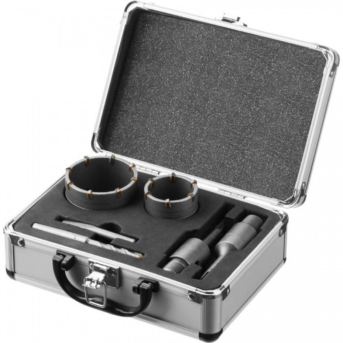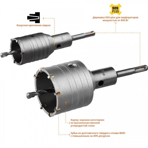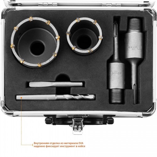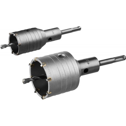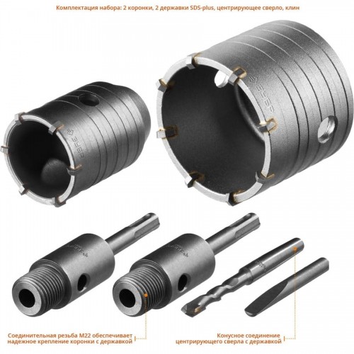 Набор коронок по бетону с оснасткой ЗУБР 29185-H2-1, предназначен для работ при прокладке коммуникаций в строящемся здании, где не обойтись без коронок по бетону. Они позволяют без труда получать отверстия среднего или большого диаметра в самых прочных материалах. Коронки имеют твердосплавные зубья из сплава ВК85, усовершенствованную систему крепления сверла на конус и резьбовое соединение с державкой М22.