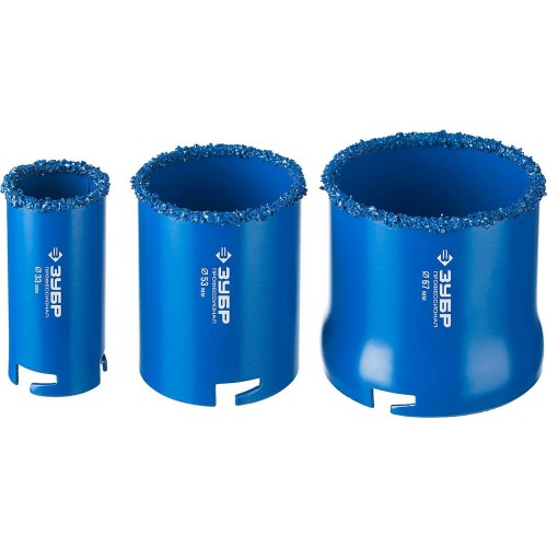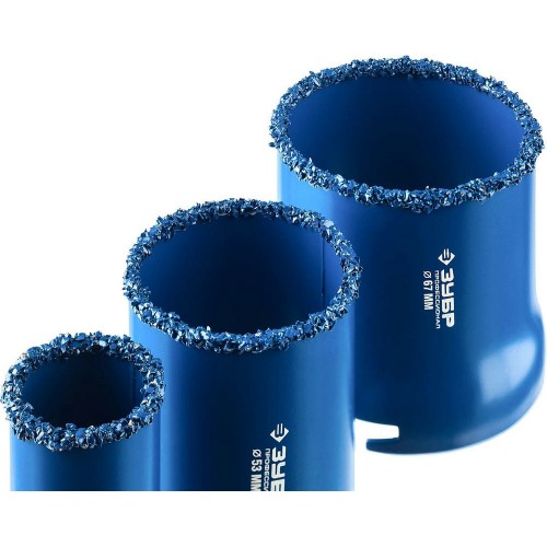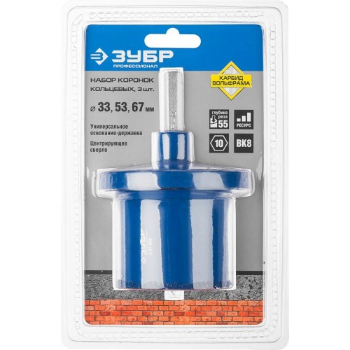 Набор кольцевых коронок ЗУБР 33350-H5, предназначен для получения ровных отверстий в облицовочных материалах, а также в ячеистом бетоне, кирпиче и гипсокартоне. Используется на дрелях и легких перфораторах в режиме безударного сверления. Кольцевые коронки с нанесением карбида вольфрама имеют высокую производительность и продолжительный срок службы. Корпус коронки имеет идеальную круглую форму, карбид-вольфрамовая крошка надежно припаяна по окружности к рабочей кромке на современной автоматической линии. Равномерное нанесение твердосплавных режущих элементов обеспечивает аккуратное сверление материала без трещин и сколов. Новейшая технология автоматического напыления и высокотемпературной спайки твердосплавной крошки к корпусу. Надежная связка карбида вольфрама благодаря термической обработке в вакууме. Глубина сверления 55 мм.