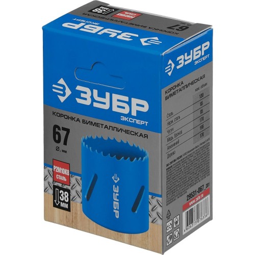 Буровая коронка биметаллическая ЗУБР 29531-067_z01, применяется при сверлении металла, дерева, ДСП, гипсокартона и твёрдых пластмасс. Универсальные биметаллические кольцевые пилы ЗУБР имеют разведённые закалённые зубья повышенной твёрдости с прогрессивным расположением. Благодаря чему гарантируется аккуратное чистовое сверление без трещин и сколов. Компенсационные прорези в корпусе обеспечивают снижение шума при работе, а также предотвращают деформацию пилы вследствие перегрева изделия.