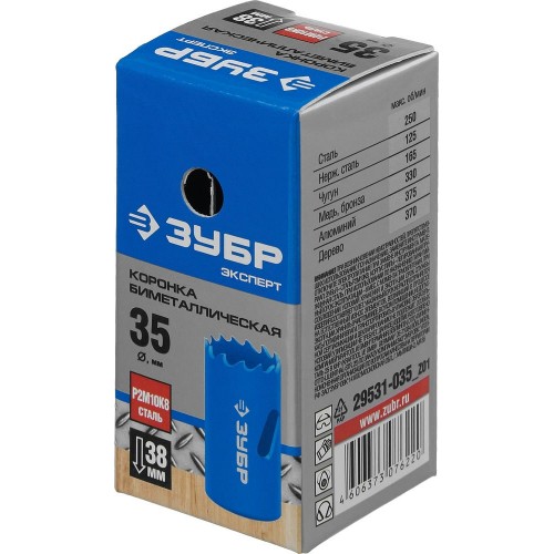 Буровая коронка биметаллическая ЗУБР 29531-035_z01, применяется при сверлении металла, дерева, ДСП, гипсокартона и твёрдых пластмасс. Универсальные биметаллические кольцевые пилы ЗУБР имеют разведённые закалённые зубья повышенной твёрдости с прогрессивным расположением. Благодаря чему гарантируется аккуратное чистовое сверление без трещин и сколов. Компенсационные прорези в корпусе обеспечивают снижение шума при работе, а также предотвращают деформацию пилы вследствие перегрева изделия.