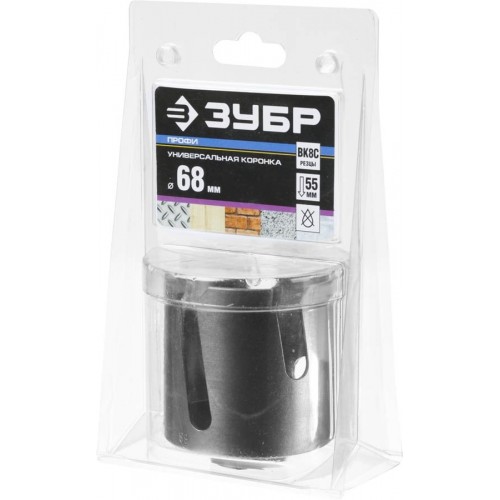 Универсальная коронка ЗУБР 29514-68, предназначена для решения разнообразных задач сверления при проведении строительных и ремонтных работ. Улучшенный твердый сплав повышает рабочий ресурс и стойкость режущих кромок. Фрезерованный корпус из высококачественной стали значительно сокращает возможные биения при работе. Специальный припой с содержанием серебра обеспечивает эффективное сопротивление ударным нагрузкам. Коронка подходит для сверления отверстий в легком бетоне, тонколистовом металле, кирпиче, керамической плитке, пластике, твердой и мягкой древесине.