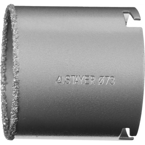 Буровая коронка с твердосплавным напылением STAYER 33345-73, предназначена для получения ровных отверстий в облицовочных материалах, а также в ячеистом бетоне, кирпиче и гипсокартоне. Равномерное напыление твердосплавных режущих элементов обеспечивает аккуратное сверление материала без трещин и сколов. Новейшая технология автоматического напыления и высокотемпературной спайки твердосплавной крошки к корпусу. Надежная связка карбида вольфрама благодаря термической обработке в вакууме.