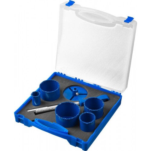 Набор применяется для получения ровных отверстий в облицовочных материалах, а также в ячеистом бетоне, кирпиче и гипсокартоне. Используется на дрелях и легких перфораторах в режиме безударного сверления.