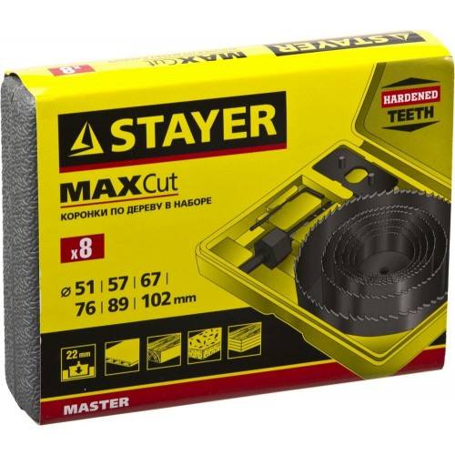 Набор коронок по дереву STAYER 29600-H8, предназначен для сверления отверстий разных диаметров в древесине, гипсокартоне, фанере, ДСП, ламинированной плите, пластике. Высококачественный и надежный инструмент. Используется при монтаже электровыключателей, распределительных коробок, осветительной фурнитуры, а также при прокладке сантехнических и канализационных трубопроводов.